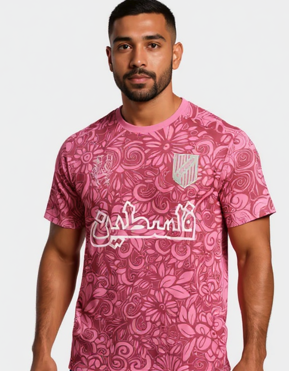 Portez un message d’espoir 🌸 Maillot conceptuel rose unique avec motifs floraux, créé en soutien au peuple palestinien. Symbolise la résistance et la beauté. Coupe unisexe.